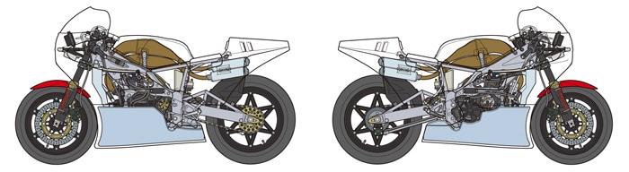 y About the Model z @Length: 166mm, Width: 52mm. The model recreates the early-season version of the bike ridden by F. Spencer. This detailed scale model closely recreates the form of the bike and allows appreciation of the unique chamber and fuel tank layout. The single-crankshaft V4 engine showcases Tamiya's trademark attention to detail. Aluminum frame and complex fuel tank are exquisitely recreated. Vinyl tubing is used to accurately model fuel pipes, accelerator, clutch cables and so on. Cowling, chamber cover and seat parts are attached using fine screws. Authentic rear suspension utilizes a metal coil spring. Comes with a racing stand to display the model. The kit includes decals to depict the bike's markings, in addition to masking seals to aid with painting.