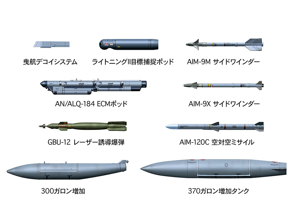 Length: 316mm, Width: 197mm Distinctive characteristics of the Block 25/32 such as smaller air intake, P&W engine nozzle, and main landing gear are all accurately reproduced. Horizontal stabilizers feature polycaps to enable free movement and flaperons can be built in either up or down positions. AIM-120C and AIM-9M/X missiles, GBU-12 laser-guided bombs, LITENING II targeting pod, and external fuel tanks all included for a variety of weapons loadouts. Pilot figure and 2 types of flight helmets included. 3 types of colorful markings, including California ANG, are included.