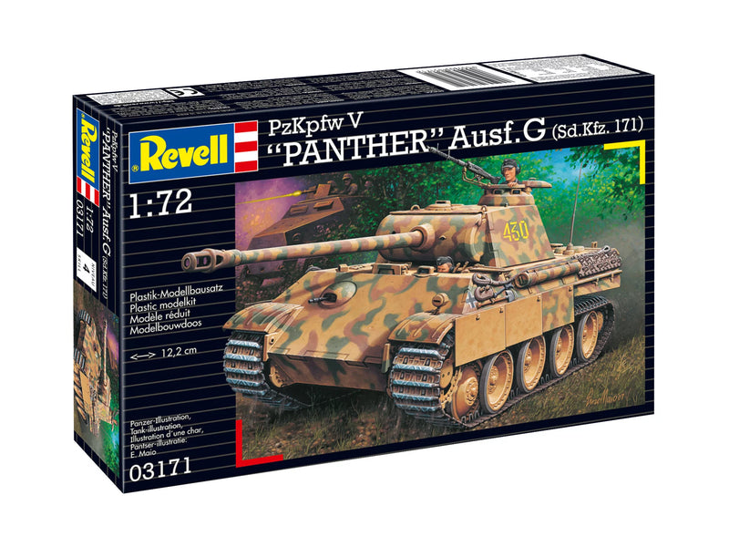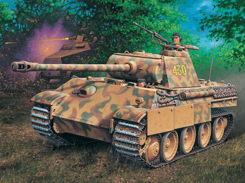 The version G was the most produced variant of the PZKPFW V Panther and replaced the execution A from 1944 in production. The chassis was designed cheaper and further improvements flowed into production continuously. Vehicles of the final version showed a modified motor deck and a shaped roller anthelet. With its 7.5 cm fighter cannon 42L/70 and storey -repellent forms, the panther proved to be a dangerous opponent. The V-12 cylinder Maybach HL 230p30 Ottomotor with 700 hp of peak performance enabled the 44,800 kg Panther Subject G a top speed of up to 55 km/h. The crew consisted of five men.