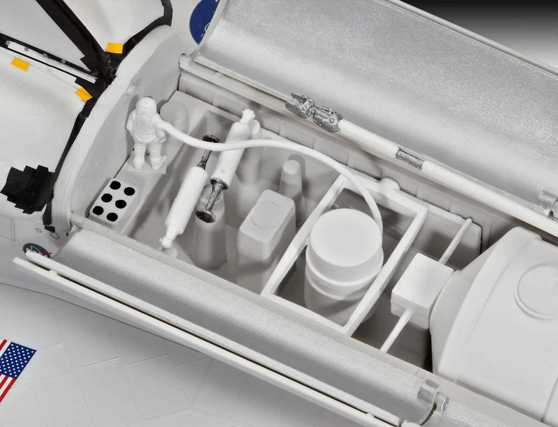 The kit is characterized by a detailed replica of the tiled structure, which reflects the Space Shuttle in its uniqueness. With the attached astronaut figure, the ESA space laboratory and the space telescope, the kit offers additional extras that make your model a real eye-catcher. The super pull-up pictures enable you to present various room ferries such as Discovery, Enterprise, Endavour and Atlantis before 1998 or Atlantis, Discovery and Endavour after 1998.