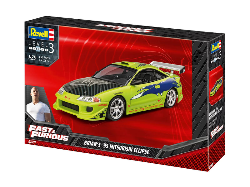 The Revell model kit from Brian's 1995 Mitsubishi Eclipse brings a classic of the Fast & Furious Film series directly into its hands. Removed on a scale of 1:25, this kit with 75 parts enables a detailed reconstruction of the iconic vehicle that drove policeman Brian OConnor in his undercover use. Recommended for model builders from 10 years, the finished model measures 179 mm in length, 78 mm in width and 53 mm in height.