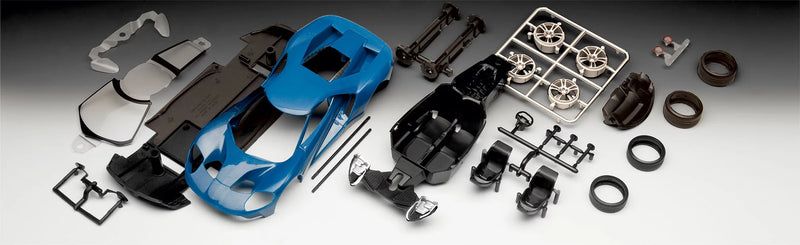 The popular Click-system model kits in a noble promotion box with a great design. Simple model kit for the 656 hp super sports car, which is comprehensively back on technology from racing and is produced in a limitation of 1,000 copies.