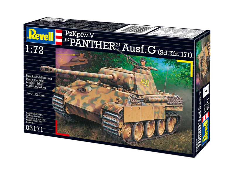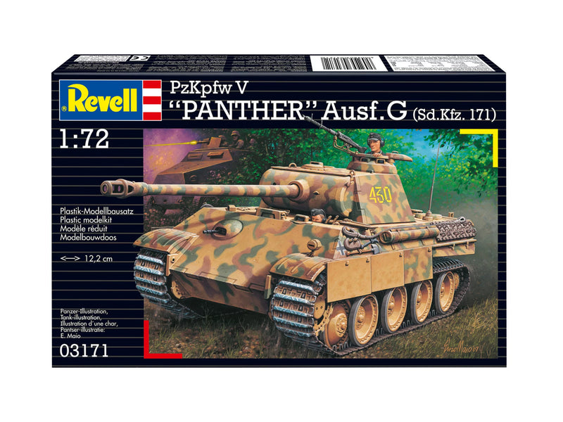 The version G was the most produced variant of the PZKPFW V Panther and replaced the execution A from 1944 in production. The chassis was designed cheaper and further improvements flowed into production continuously. Vehicles of the final version showed a modified motor deck and a shaped roller anthelet. With its 7.5 cm fighter cannon 42L/70 and storey -repellent forms, the panther proved to be a dangerous opponent. The V-12 cylinder Maybach HL 230p30 Ottomotor with 700 hp of peak performance enabled the 44,800 kg Panther Subject G a top speed of up to 55 km/h. The crew consisted of five men.