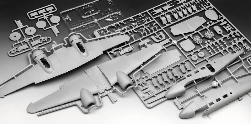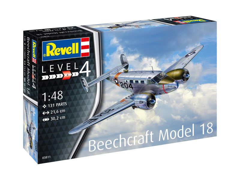 Discover the detailed model kit of the legendary Beechcraft Model 18! This 1:48 scale aircraft model, with an impressive length of 216 mm and a total of 129 precisely manufactured parts, is an absolute highlight for every model building friend.
